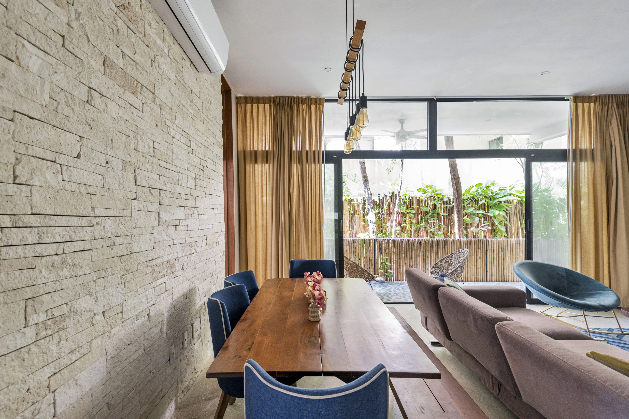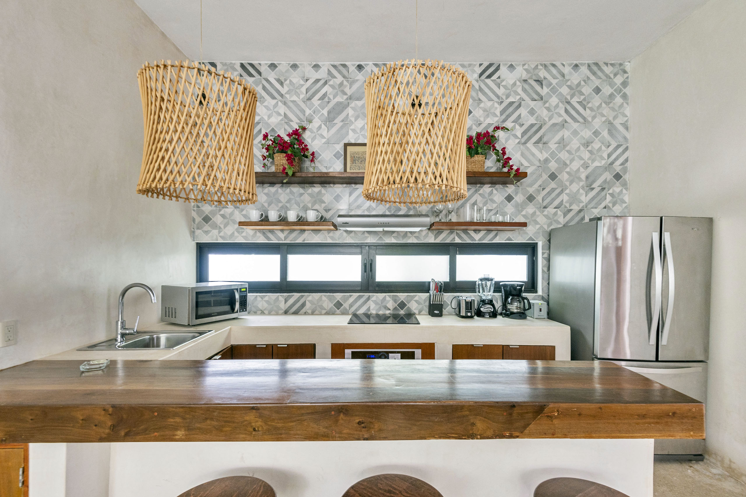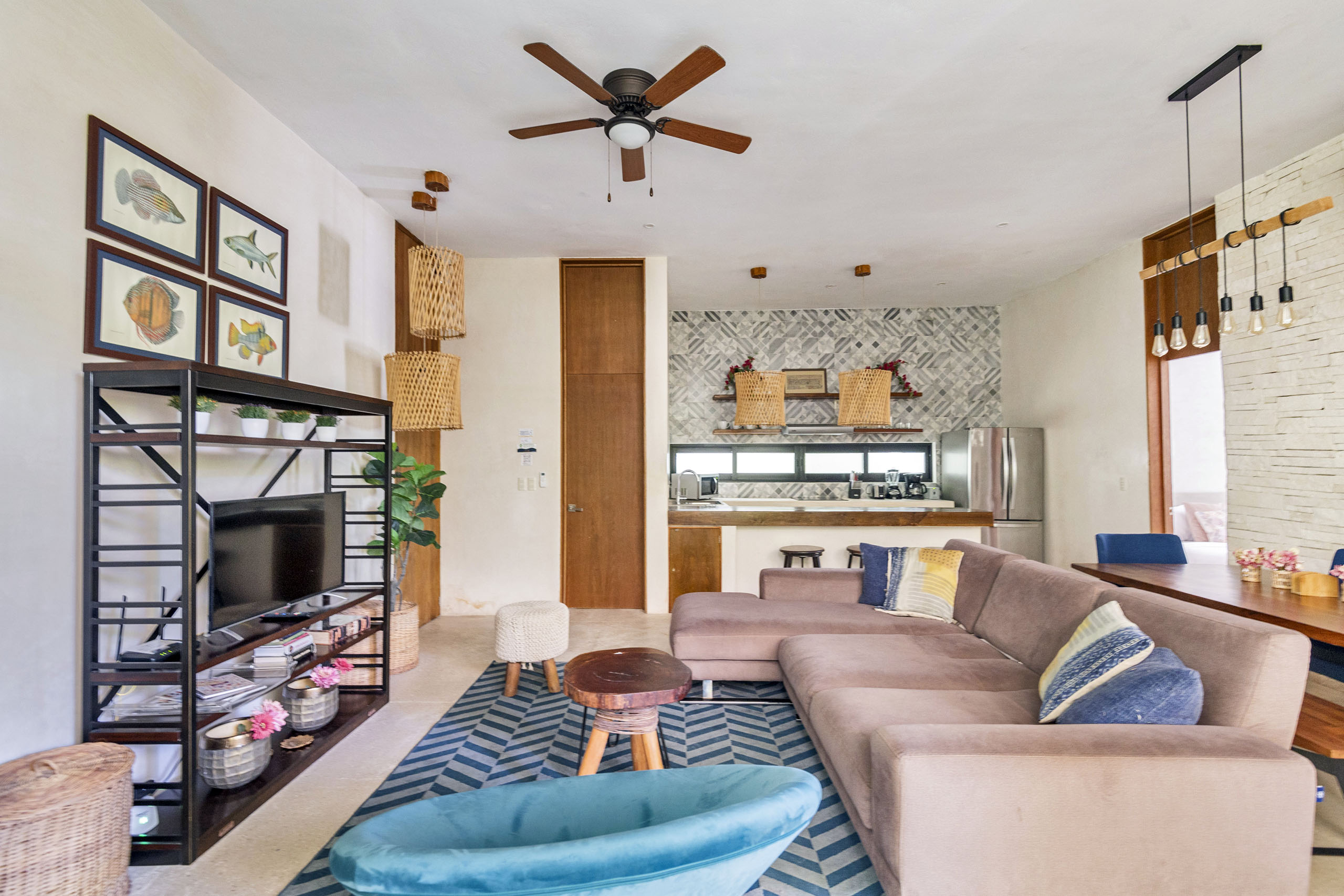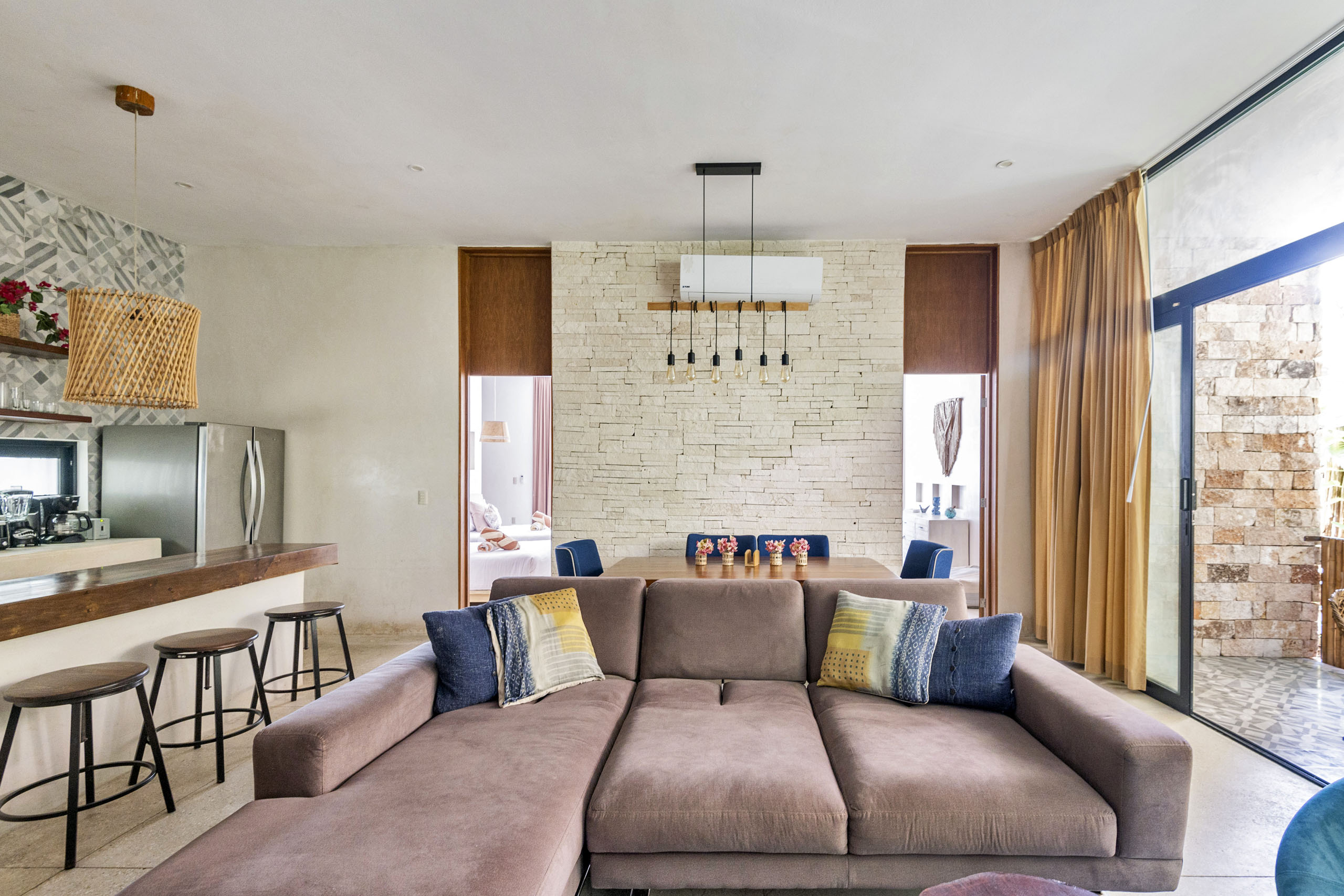 Step into a world where modern sophistication harmonizes with the soulful allure of Tulum’s natural beauty. Adorned with contemporary furnishings and curated decor, the spacious living area beckons you to unwind on plush sofas, basking in the dappled sunlight that filters through the expansive windows. With a thoughtfully designed open floor plan, the living, dining, and kitchen areas seamlessly flow together, fostering a sense of togetherness and easy living.