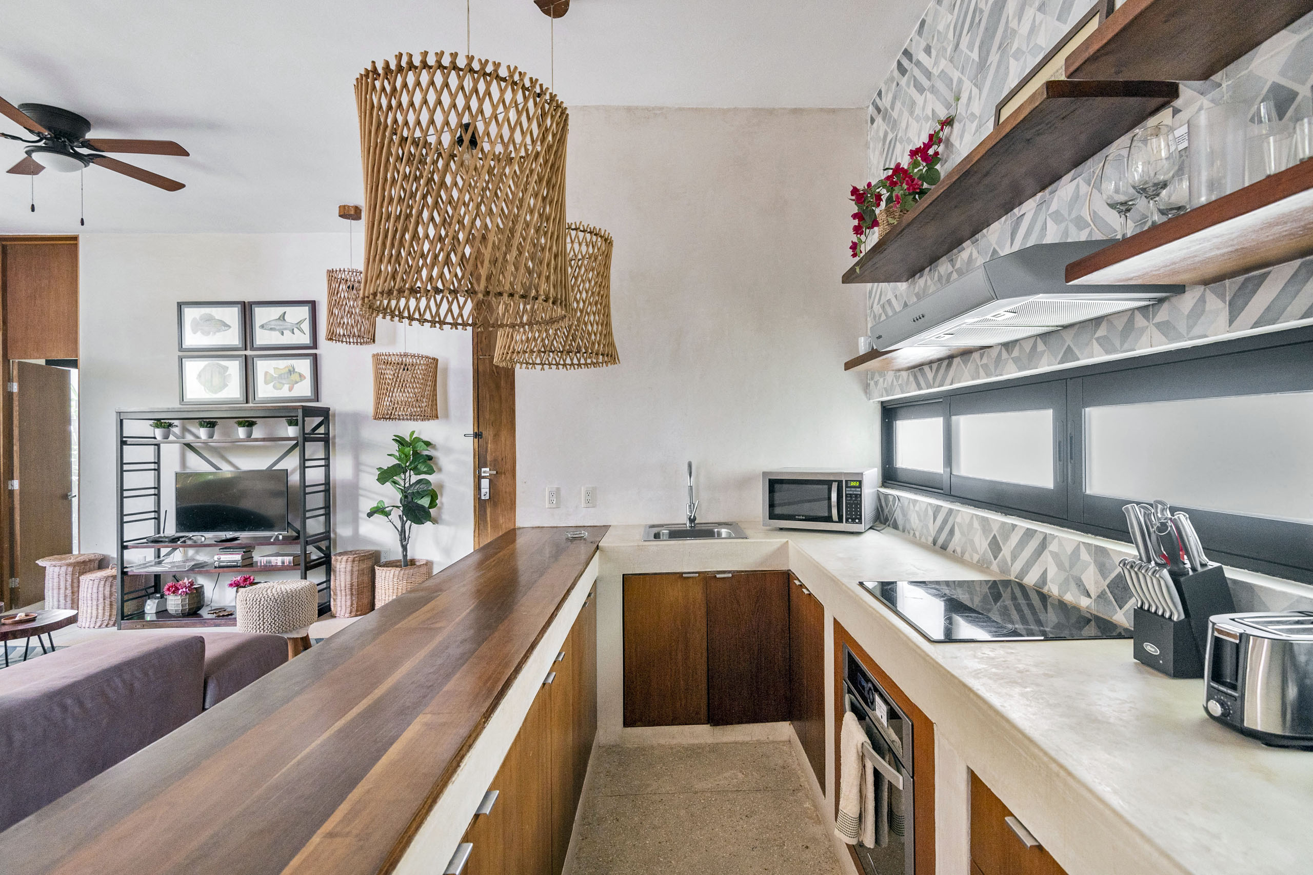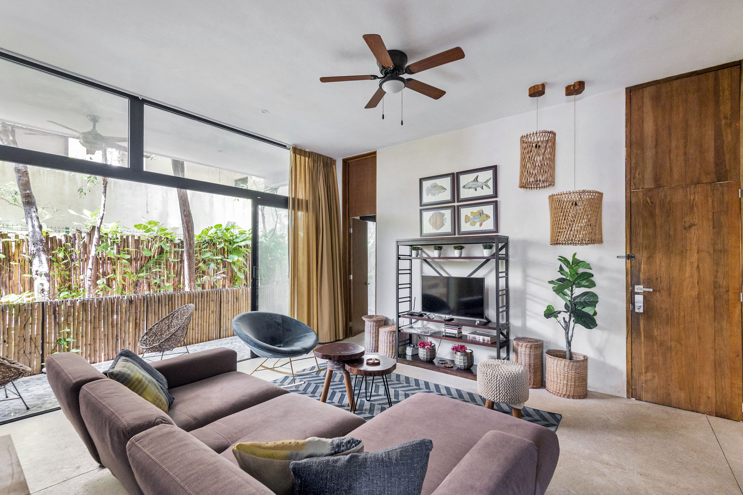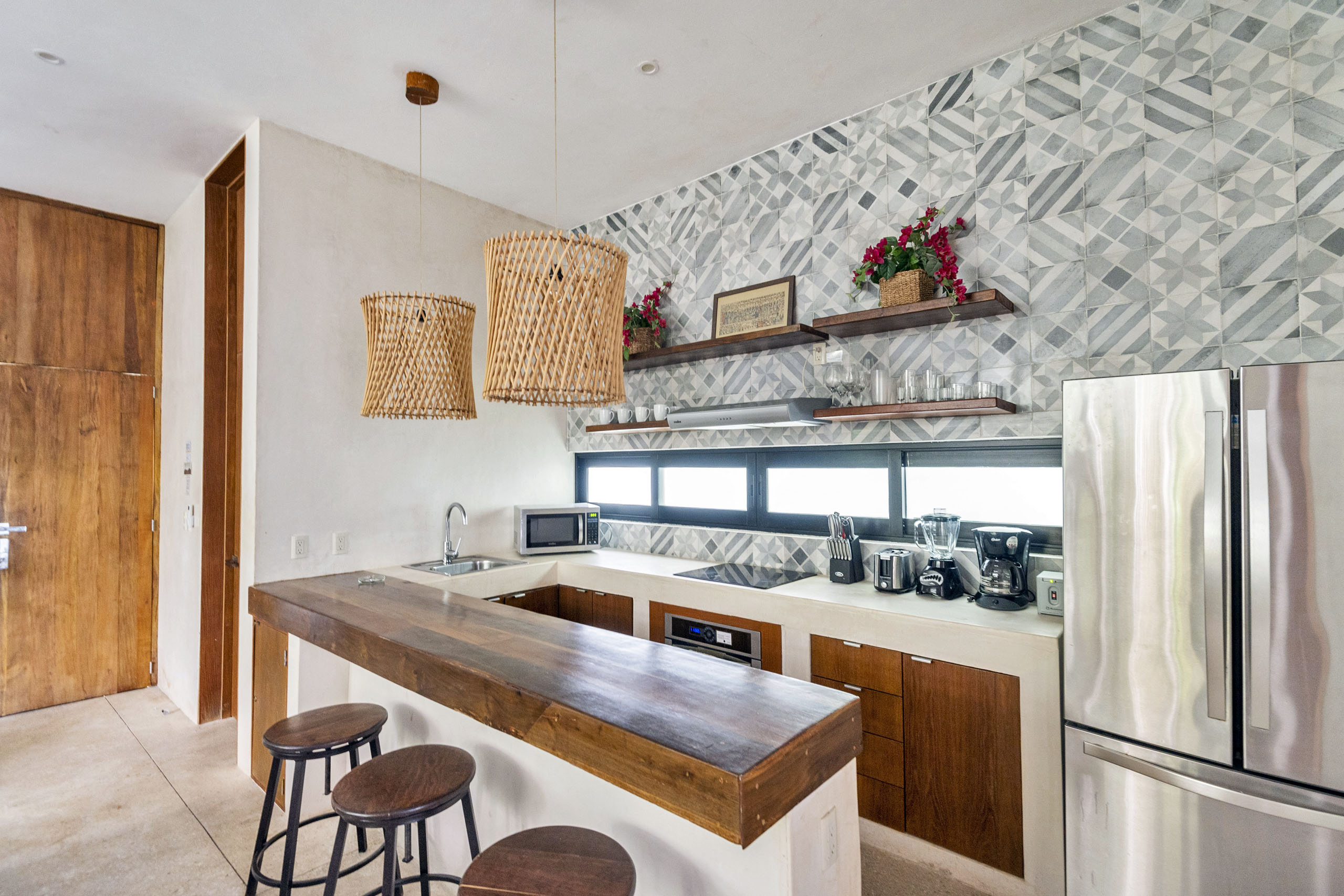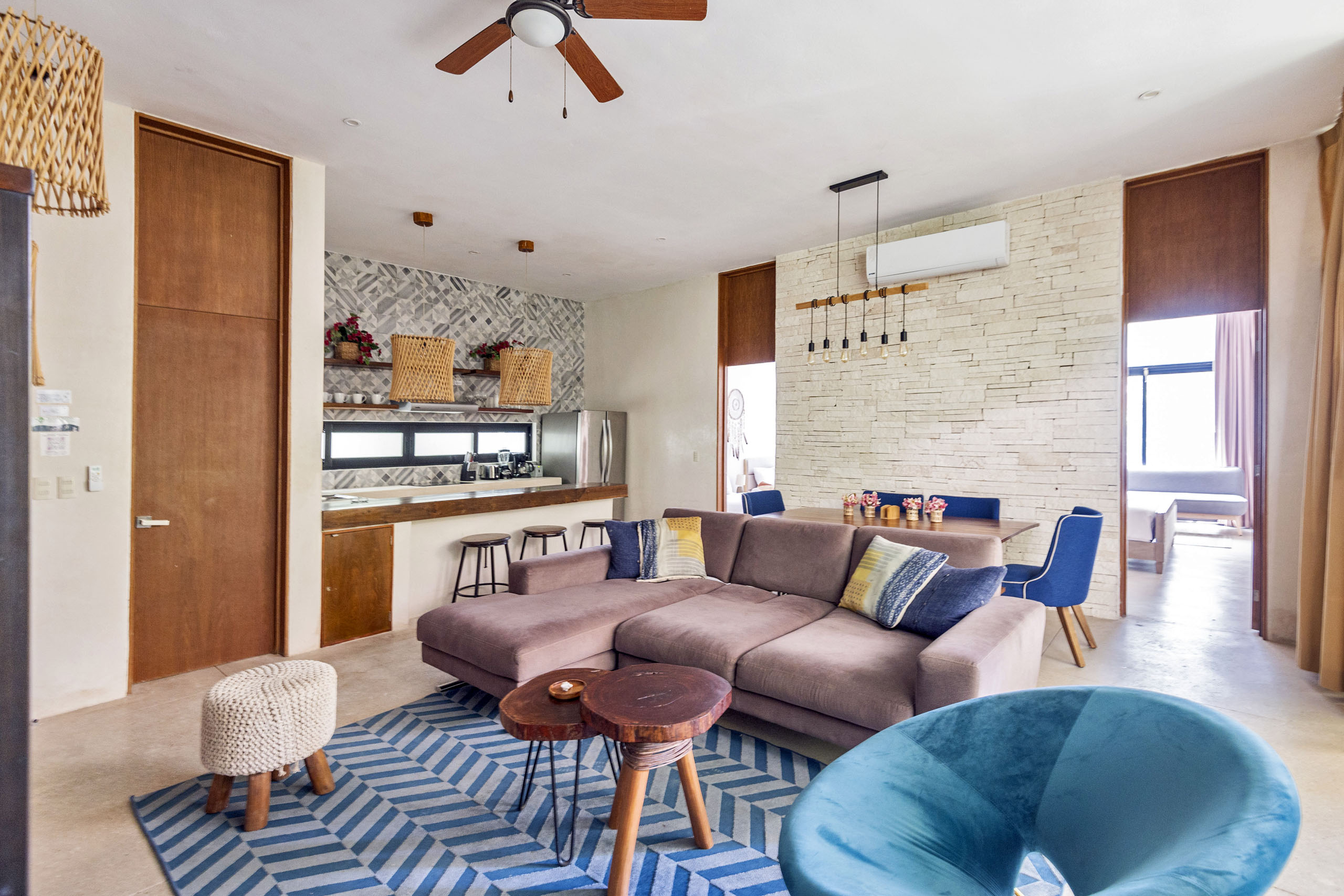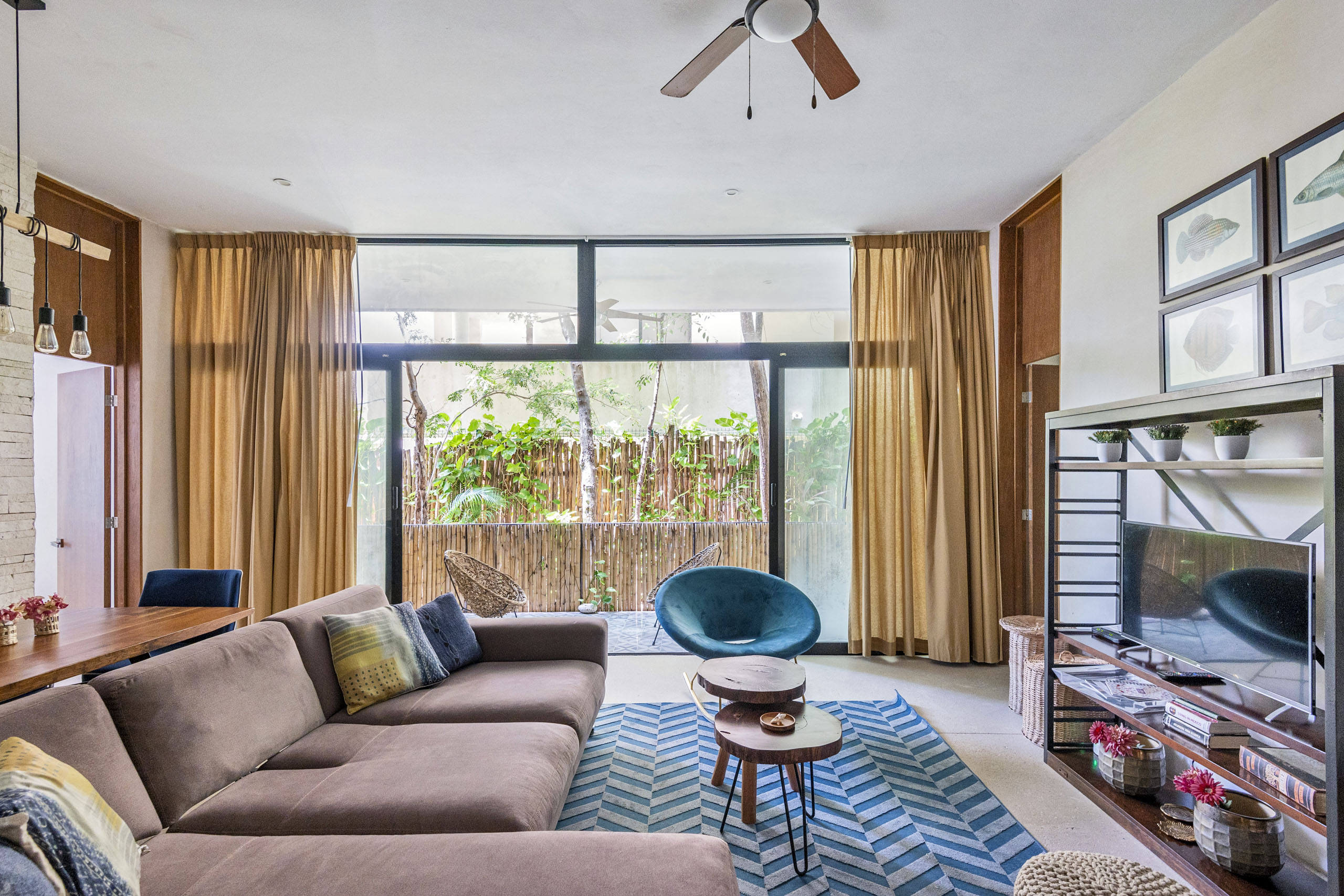 Step into a world where modern sophistication harmonizes with the soulful allure of Tulum’s natural beauty. Adorned with contemporary furnishings and curated decor, the spacious living area beckons you to unwind on plush sofas, basking in the dappled sunlight that filters through the expansive windows. With a thoughtfully designed open floor plan, the living, dining, and kitchen areas seamlessly flow together, fostering a sense of togetherness and easy living.