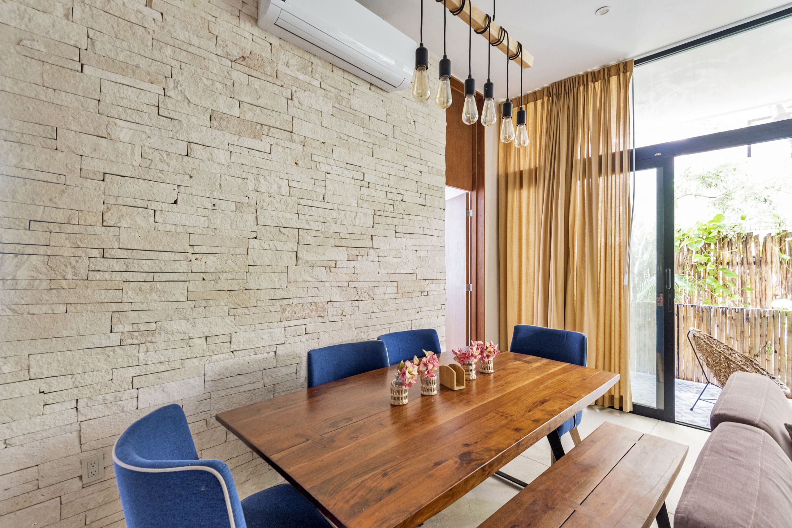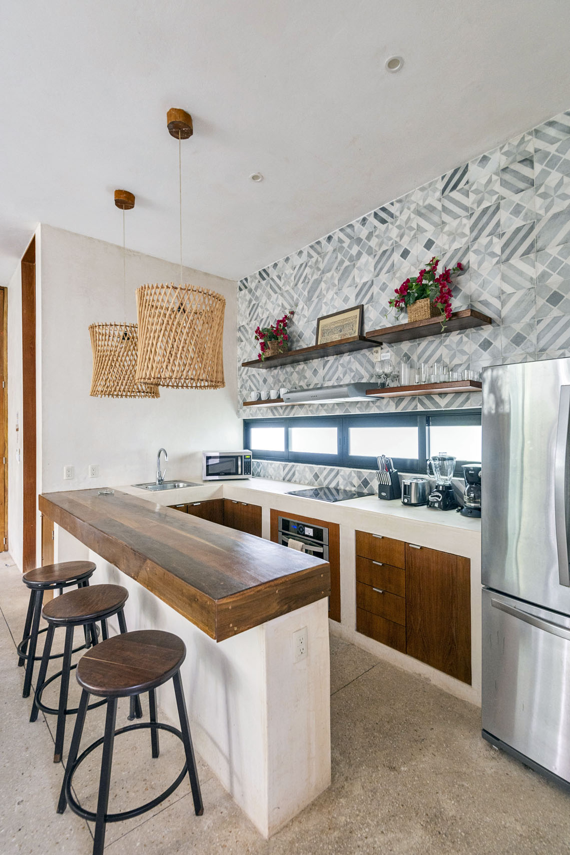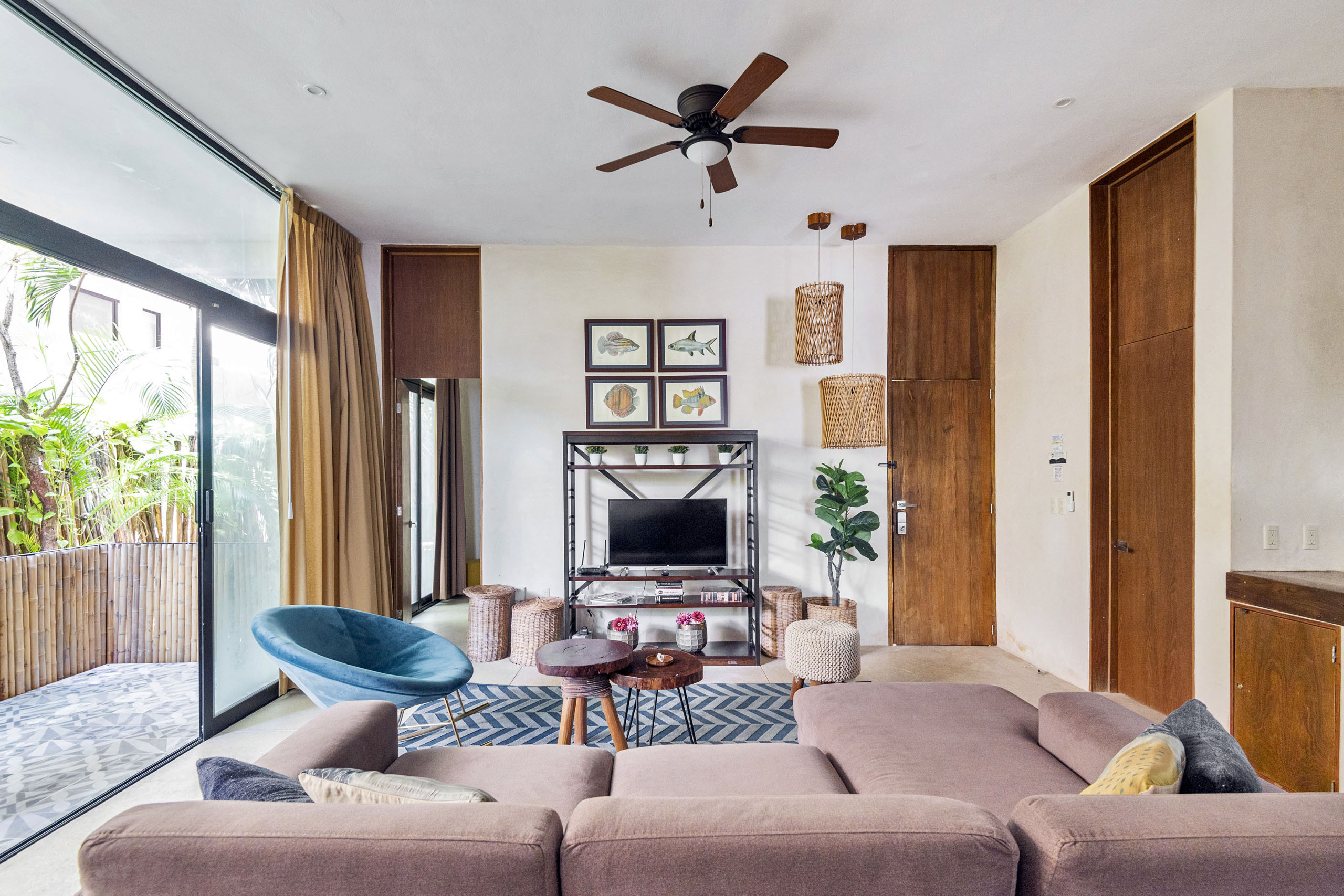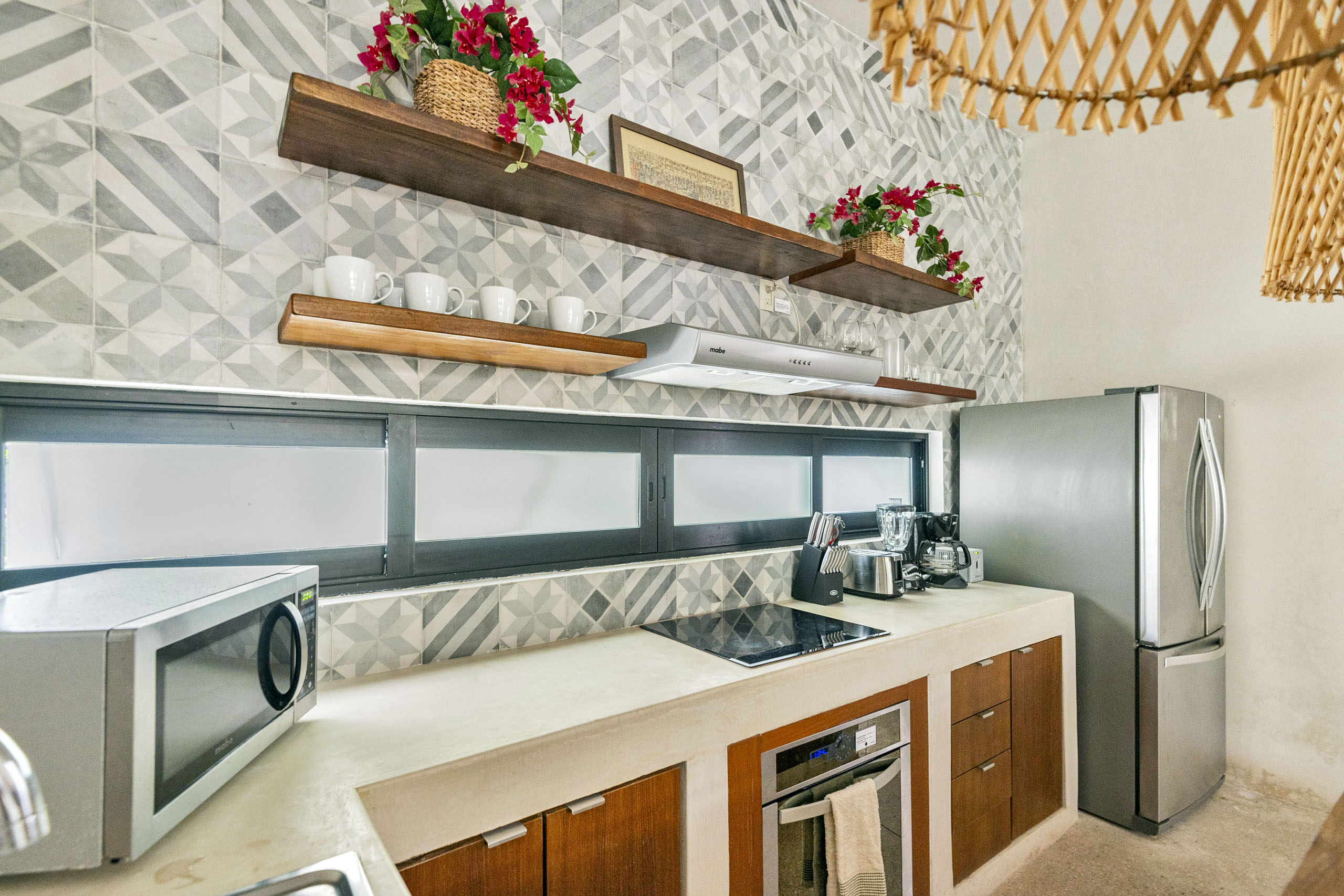 Step into a world where modern sophistication harmonizes with the soulful allure of Tulum’s natural beauty. Adorned with contemporary furnishings and curated decor, the spacious living area beckons you to unwind on plush sofas, basking in the dappled sunlight that filters through the expansive windows. With a thoughtfully designed open floor plan, the living, dining, and kitchen areas seamlessly flow together, fostering a sense of togetherness and easy living.